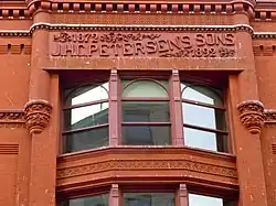 J.H.C. Petersen was an immigrant from Schleswig in present-day Germany where he was educated until he was 16.[4] After settling in Scott County, Iowa he worked in farming and at a match-factory. He and his three sons Max, Henry, and William opened a dry goods store in 1872. By 1875 they were handling both wholesale and retail lines of merchandise from Chicago.[5] Branch stores were opened in Clinton, Iowa and Geneseo, Illinois in the 1880s. The J.H.C. Petersen's Sons' Store was built in Downtown Davenport in 1892. The structure was designed by Frederick G. Clausen, a German immigrant who moved to Davenport. It followed the latest marketing principles of the day with specialized departments under one roof. The three sons took over the store's operations at this time. During this same time period, several competitors established operations in the city. J.H.C. died in 1910 and Max and Henry died in 1915. The following year William sold the store to one of their competitors, Harned and Von Maur Co. In 1928 the J.H.C. Petersen's Sons' store was consolidated into the Petersen-Harned-Von Maur Store and it ceased independent operations.[6] The Redstone Building, however, would continue to house the flagship store well into the 20th century, keeping the Petersen name until 1989.[6] The name of the department store chain, which expanded in several Midwest states, was simplified to Von Maur.[7]