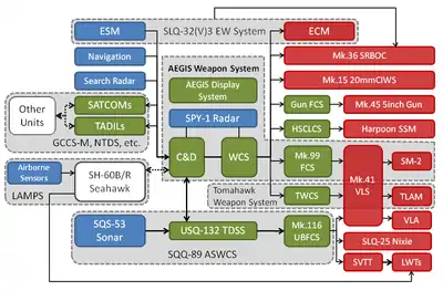 The computer-based command-and-decision (C&D) element is the core of the Aegis Combat System and came from the Naval Tactical Data System (NTDS) threat evaluation and weapons assignment (TEWA) function.[5] This interface makes the ACS capable of simultaneous operation against almost all kinds of threats.