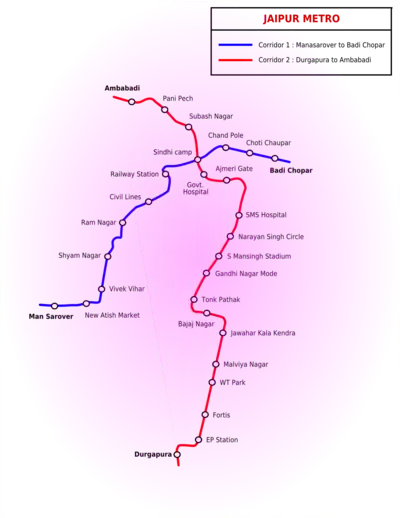 The first route of Jaipur Metro (East-West Corridor) connect Mansarovar to Badi Chaupar via Civil Lines and Chandpole. In Phase I-A, the metro was operating between Mansarovar to Chandpole. The construction of Phase-1B between Chandpole and Badi Chaupar is completed. This is the Metro line that got flagged off on 5 June 2015, and has been named as Pink Line, as it takes passengers to the Pink City.[1] The depot for this line is situated at Mansarovar.[16]