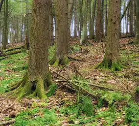 Jakey Hollow Natural Area is considered to be a Northern Conifer Forest Natural Community.[1] Approximately half of the natural area is old-growth forest.[4] The main tree species in the natural area are second-growth eastern hemlock, a small amount of virgin hemlock, and hardwood trees. Additionally, numerous other tree species inhabit the area. There are three oak species: chestnut oak, red oak, and white oak. Other tree species include American beech, black birch, black cherry, white pine, and white ash.[1] The white pine population in the natural area consists of dozens of individuals, some of which more than 100 feet (30 m) high.[4]