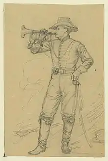 During this latter phase of service, he was promoted from the rank of sergeant to Chief Bugler and transferred from C Company to his regiment's field and staff officers' corps on May 1, 1863. A month later, he was wounded while in service on June 9[5] in operations related to the Battle of Brandy Station. According to historian Samuel P. Bates:[6]