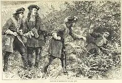Following the battle a reward of £5,000 was offered for his capture.[22] On 8 July 1685, Monmouth was captured and arrested near Ringwood in Hampshire,[23] by tradition "in a field of peas". The events surrounding his capture are described by George Roberts in Tait's Edinburgh Magazine.[24]