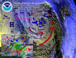 A dip in the jet stream had created a trough which was causing rain in northern Florida with snow in Georgia. By the morning of the 24th, it was located in the northeastern Gulf of Mexico near Apalachicola, Florida. By the evening of the 24th, the storm was rapidly intensifying against the South Carolina coast. By Tuesday January 25th, it was near Hatteras, North Carolina. The storm moved northeastwards along the Atlantic Seaboard. Later on in the day it was located 80 miles east of Long Beach Island, New Jersey. It then began to weaken and by the next morning on the 26th, it was located just east of Portland, Maine. The storm was poorly forecasted because of the other simultaneous storm events and awkward build-up of two low pressure systems.[2]