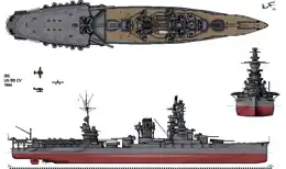 The Ise class was designed as an improved version of the preceding Fusō class. The ships had a length of 208.18 metres (683 ft) overall, a beam of 28.65 metres (94 ft) and a draught of 8.93 metres (29 ft 4 in) at deep load.[1] They displaced 29,980 long tons (30,460 t) at standard load and 36,500 long tons (37,100 t) at deep load, roughly 650 long tons (660 t) more than the earlier ships. Their crew consisted of 1,360 officers and ratings.[2]