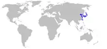 The range of the Japanese bullhead shark extends from Japan to the Korean Peninsula, and southward along the coast of China to Taiwan. A single, apparently erroneous, record from off East Africa is reported. This bottom-dwelling shark inhabits the continental shelf at a depth of 6–37 m (20–121 ft), preferring areas covered by rocks, rocky reefs, or kelp.[1]