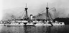 During the Battle of the Yalu River on 17 September 1894, Fusō was assigned to the rear of the Japanese main body and was heavily engaged by the Chinese ships. Although hit many times by 6-inch (152 mm) shells, not one penetrated her armor; of her crew only five were killed and nine wounded.[23] During the battle her crew fired twenty-nine 24 cm, thirty-two 17 cm, one hundred thirty-six 75 mm, one hundred sixty-four 2.5- and 3-pounder shells and over fifteen hundred shells from her machine guns.[24] The ship was present during the Battle of Weihaiwei in January–February 1895,[25] although she did not see any significant combat.[26] On 29 October 1897, Fusō's anchor chain broke during a strong gale off Nagahama, Ehime and she collided with the ram of the protected cruiser Matsushima at 16:30. She then struck Matsushima's sister ship, Itsukushima, and sank at 16:57.[25] Re-classed as a second-class battleship on 21 March 1898 and refloated on 7 July,[25] Fusō was repaired at Kure Naval Arsenal and ran her trials on 8 April 1900.[5]
