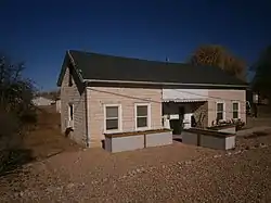 The building is an example of what has been termed a "Type IV pair-house", given it has a tripartite plan (appears to have three equal-sized rooms, each with two bays, and an indented porch in the center section. The outside rooms are stone with a coursed ashlar finish; the center section is adobe, plastered over and marked off on the front to resemble stonework. In 1981, the house remained in a similar condition as when it was built, 110 years before, with the only significant change being a shed roof frame extension to the rear.[2]