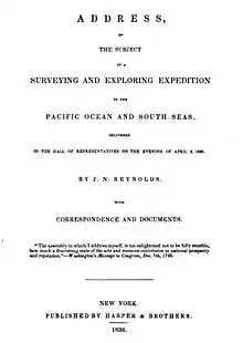 In the January 1837 issue of the Southern Literary Messenger, Edgar Allan Poe reviewed Reynolds' "Address, on the Subject of a Surveying and Exploring Expedition to the Pacific Ocean and South Seas (New York, 1836) first given to the House of Representatives on April 2, 1836".[4]