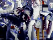The final scene of the video shows Jeremy striding into class shirtless, tossing an apple to the teacher, and standing before his classmates. He reaches down and draws back his arm as he takes a gun out of his pocket. (The gun only appears onscreen in the unedited version of the video.) The edited version cuts to an extreme close-up of Jeremy's face as he puts the barrel of the gun in his mouth, closes his eyes, and pulls the trigger. After a flash of light, the screen turns black. The next shot is a pan across the classroom, showing Jeremy's blood-spattered classmates, all completely still, recoiling in horror. The video ends on a shot of a dangling blackboard, on which all the harsh terms and phrases seen earlier are scrawled.