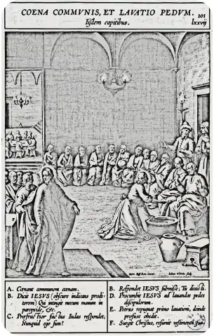 Nadal commissioned several artists to do the engravings, 153 in all, and himself wrote extended captions which included references to parts of the scenes. The engravings, Evangelicae Historiae Imagines, were published in Antwerp in 1593, thirteen years after Nadal's death.[4] This is the oldest collection of such engravings that are extant; they use the art of perspective which was new at the time.