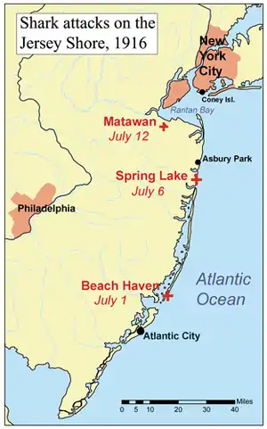 - ↑ "Shark Guards Out At Beach Resorts; Wire Nets Set Against Supposed Man-Eater That Killed Spring Lake Bather," The New York Times, July 8, 1916, p. 18.