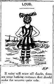 After the first fatality, newspaper cartoonists began using sharks as caricatures for political figures, German U-boats, Victorian morality and fashion, polio, and the deadly heat wave threatening the Northeast at the time. Fernicola notes, "Since 1916 was among the years that Americans were trying to break away from the rigidity and conservatism of the Victorian period, one comic depicted a risqué polka-dot bathing suit and advertised it as the secret weapon to keep sharks away from our swimmers." Another cartoon depicted "an exasperated individual at the end of a dock that displays a 'Danger: No Swimming' sign and mentions the three most emphasized 'danger' topics of the day: 'Infantile Paralysis (polio), Epidemic Heat Wave, and Sharks in the Ocean'." The cartoon is entitled "What's a Family Man to Do?"[64] With World War I ongoing in 1916 and America's growing distrust of Germany, cartoonists depicted U-boats with the mouth and fins of a shark assaulting Uncle Sam while he wades in the water.[65]