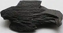 Jet is around 75% carbon and 12% oxygen with sulfur and hydrogen making up most of the balance.[7] Other elements are found at trace level and the exact ratios varying with the source; for example, Spanish jet contains more sulfur than Whitby jet.[7] Jet has a Mohs hardness ranging between 2.5 and 4 and a specific gravity of 1.30 to 1.34. The refractive index of jet is approximately 1.66. The touch of a red-hot needle should cause jet to emit an odour similar to coal.[8]