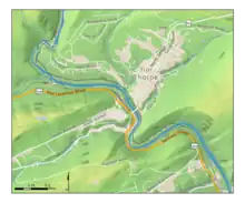 The town is 4 miles (6 km) east of Nesquehoning, which is up a steep grade and around the bend along U.S. 209 South, and also butting up against the slopes of Mount Pisgah. This was a key element in the LC&N's planning, for the grade from the mountain ridge down to the river enabled them to fill barges quickly, using chutes and an elevated entry from a road down the ridge face. Jim Thorpe's developed elevations range between the river slack water at 540 feet (160 m) above sea level—720 feet (219.5 m) to the town's upper streets, all below the western peak of Mount Pisgah, which tops out at 1,519 feet (463.0 m) above sea level.[6][7]