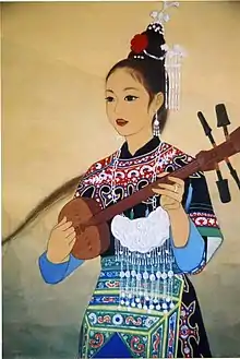 Nihonga painting "Tong Tribe Pipa-Changfamei (Guizhou, China)"