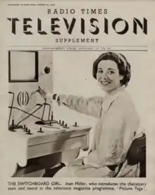 Miller was the face of Picture Page, a topical magazine programme that began on the nascent BBC television service in 1936. In the programme Miller played the part of a switchboard operator "connecting" viewers to the show's guests; "introducing visitors, types and personalities". Before each interview Miller, sitting at a telephone switchboard, would introduce each guest.[1] The programme was popular amongst early television viewers.[2] However, the mock switchboard's homespun look was found to be irksome by the Television and Short-Wave World magazine.[3] Miller got the job on the strength of her having been a trainer of switchboard operators in Vancouver.[4]