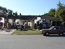 Crew filming Jobs at Steve Jobs' childhood home in Los Altos, California.