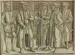 - ↑ From an 1887 edition of Foxe's Book of Martyrs illustrated by Kronheim. According to Foxe, a Catholic speaker, Mr. Bourne, had nearly driven his Protestant listeners to riot, but Bradford came to his rescue and calmed the mob.
