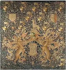 A wool and silk tapestry manufactured in the Southern Netherlands exists in The Cloisters Collection in the Cloisters Collection of the Metropolitan Museum of Art in New York that illustrates Lord Dynham's armorial bearings and heraldic badges set against a millefleurs backdrop.[23][24][25] The tapestry was made after Lord Dynham's election as a knight to the Order of the Garter in 1487,[25] as the blue emblem of the Garter has been included in the panel. The weaving comprises the following inscribed motto: hony soit qui male y pense (typically spelled: Honi soit qui mal y pense), serving as a terminus a quo for the dating of the tapestry.[26][27] The tapestry could not have been ordered after 1501, the year of his death, and also functions as a terminus post quem. Scholars believe it was commissioned between 1487 and 1501.[26] It is possible that this panel was ordered from the Tournai tapestry dealers Pasquier Grenier and his son, Jean Grenier.[28][26] They supplied tapestries to King Henry VII in 1486 and 1488.[26]