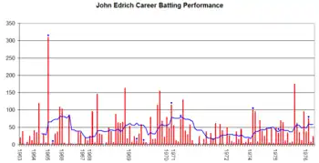 Injuries to other players resulted in another recall to the England side for the Third Test against New Zealand at Headingley in July 1965, where he scored 310 not out.[2] This innings spanned over eight hours, and included 52 fours and five sixes – 238 runs or 77% of his innings.[7] Commentators at the time said that he might have broken the existing Test record of 365 within another 90 minutes or so if his captain, Mike Smith, had not felt it necessary to declare the innings closed. However, a week later during the First Test against South Africa, he suffered a blow to the head from a short-pitched delivery by Peter Pollock. This was before helmets came into use, and he was forced to retire hurt on 7 not out.[8] Wisden named Edrich as Cricketer of the Year in 1966 for his achievements in 1965, alongside Colin Bland, Dick Motz, Graeme Pollock and brother Peter Pollock. As well as his Test triple century, he had scored a total of 2,319 runs at an average of 62.67 during the season, including eight hundreds. At one stage, in nine successive innings he scored 139, 121*, 205*, 55, 96, 188, 92, 105 and 310*. Not previously known as a big hitter, he struck forty-nine sixes during the course of the season.