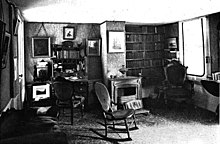 The John Greenleaf Whittier House was built in 1811. At that time it was a 1+1⁄2-story wood-frame Cape style cottage, with four rooms on the ground floor and one in the attic. A kitchen ell and shed were added to the back. The house was purchased by Whittier in 1836 to provide accommodation for himself as well as his mother, aunt, and sister Eliza.[2] He lived here until his death in 1892.[3] Whittier wrote most of his poetry and prose in this house, including his classic Snow-Bound, which he wrote in the Garden Room.