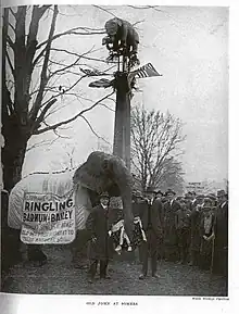 - ↑ "Town Heaps Honors on Old Bet's Grave. But Pap Fellowes and His Cornet Inject a Little Discord in Memorial to an Elephant. But the Youngsters All Enjoy It and Feed Peanuts to Old John, Who Lays Wreath on Monument". New York Times. April 14, 1922. Retrieved 2010-01-08.