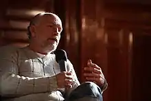Malkovich stated in a 2011 interview that he is not a "political person" and that he does not have "an ideology", revealing that he had not voted since George McGovern lost his presidential run in 1972.[63] At the Cambridge Union Society in 2002, when asked whom he would most like to fight to the death, Malkovich replied that he would "rather just shoot" journalist Robert Fisk and politician George Galloway, stating that Galloway was not honest. Journalists speculated that the comment was related to criticism of Israel and the war in Iraq.[64][65]