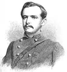 In March 1863, Mosby conducted a daring raid far inside Union lines near the Fairfax County courthouse. He was helped, according to his own account, by a deserter from the 5th New York Cavalry regiment named James Ames, who served under Mosby until he was killed in 1864.[21][22] He and his men captured three Union officers, including Brig. Gen. Edwin H. Stoughton. Mosby wrote in his memoirs that he found Stoughton in bed and roused him with a "spank on his bare back."[23][24] Upon being so rudely awakened the general indignantly asked what this meant. Mosby quickly asked if he had ever heard of "Mosby". The general replied, "Yes, have you caught him?" "I am Mosby," the Confederate ranger said. "Stuart's cavalry has possession of the Court House; be quick and dress." Mosby and his 29 men had captured a Union general, two captains, 30 enlisted men, and 58 horses without firing a shot.[25][26] Mosby was formally promoted to the rank of captain two days later, on March 15, 1863, and major on March 26, 1863.[27]
