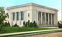 Gates died in Paris, France, on August 9, 1911, following an unsuccessful operation to remove a throat tumor.[89][3][31][90] His funeral was held on August 23, 1911, in the ballroom of the Plaza Hotel in New York; Gates had provided the funding for the construction of the hotel.[91][92] Gates' mourners had come from all parts of the country; three floors of the Plaza Hotel were reserved for those attending his services. A large delegation arrived from Texas, where Gates had done much for the city of Port Arthur.[93][92]