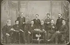During its annual meeting in June 1913, the society decided to send a delegation to United States primarily to raise funds for the National House. It was decided that Basanavičius should go and that Martynas Yčas would accompany him.[4] Basanavičius hesitated, citing his health issues, but agreed.[5] They visited Lithuanian American communities on the East Coast (New York, Illinois, Pennsylvania and elsewhere). They were discouraged by lax manners of the Lithuanians, infighting between local communities, and attacks by socialists (for example, Vincas Mickevičius-Kapsukas wrote to Lithuanian American socialist press urging to boycott the donation drive).[6] Basanavičius deeply resented such attacks as to him loyalty to one's nation far outweighed loyalty to one's class or political views.[7] In total, they visited 84 Lithuanian communities in 120 days and collected $23,799 from some 6,000 donors.[8] The money was not enough to build the National House and it was lost in a Russian bank during World War I.[9]