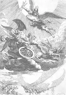 The apotheosis of what Vondel achieved as a playwright occurred one year later with the publication of what many would call his absolute masterpiece, Lucifer (1654).[76] In Lucifer Vondel not only achieves what has been called "a triumph of the poetic imagination", but also a dramatic effect that is the result of characters who are at the height of their powers, but have conflicting aspirations, so that their relationships are leading to the greatest tensions.[77][78] For this reason this work has been called "Vondel's Baroque piece par excellence", since the greatest contrasts and conflicts - typical for the Baroque - are the subject matter of the work.[78] The play, which is in essence the primordial conflict between good and evil, is about the rebellion against God and the two consequences it had, namely the Fall of the Angels and the Fall of Man.[76] Although the play is about the battle between good and evil, one of the most acclaimed aspects of the work is the fact that its characters, especially Lucifer, are much more complex and do not act either entirely good or evil.[79][75] In February 1654, the authorities unexpectedly removed the performance of Lucifer from the repertoire; this time the controversy was apparently not of a political nature, as with Palamedes, or because the play included Catholic imagery (the Catholic elements in Lucifer were absent), but simply because of the sacrilegious aspect of “showing the high matter of the depths of God”.[80][81][82]