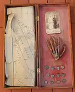 In 2015, Lopez's great-grandchildren found a box in their late grandfather's attic which appeared to contain the items found by Ernesto Lopez along with his wedding photo. The family brought the box to the attention of a local reporter, whose TV news report on the strange find was picked up by several national and international news outlets.[38][39][40] However, upon examination, experts at the Tampa Bay History Center determined that the box contained several non-precious old coins, souvenirs from early Gasparilla parades, and a plat map from the 1920s with local streets, businesses, and landmarks from that time clearly depicted. The origin of the hand remained a mystery, though the curator of the history center opined that it might be a mummified monkey hand.[37][40]