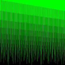 A drawing for the Josephus problem sequence for 500 people and skipping value of 6. The horizontal axis is the number of the person. The vertical axis (top to bottom) is time (the number of cycle). A live person is drawn as green, a dead one is drawn as black.[1]