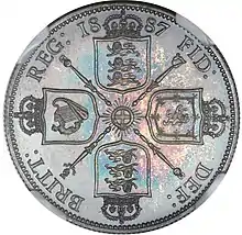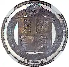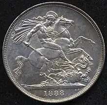 For the various reverses, according to Dyer and Gaspar, "Fremantle had revived some of the finest heraldic designs from the past".[16] He felt that a reverse design with the denomination inside a wreath was "feeble", and sought artistic designs.[16] Fremantle selected designs originating with the Great Recoinage of 1816–1817 or even further back, and these were engraved by Wyon.[17] In 1873, soon after he had assumed the deputy mastership, Fremantle had secured the return of Benedetto Pistrucci's 1817 design of Saint George and the Dragon to the sovereign,[16] for the first time in almost half a century.[18] This design appeared on the gold sovereign, double sovereign and five-pound piece of the Jubilee coinage, and also on the silver crown, or five-shilling piece.[19] Beginning with the Jubilee coinage, a plume was restored to Pistrucci's design; it had featured in his original work, but had later been omitted.[20] The sixpence, shilling, florin, half crown, half sovereign and a new coin, the double florin, were given variations of the ensigns armorial of the United Kingdom. This was done in several guises: thus, according to the proclamation making them current that was issued in May 1887, the half sovereign had a "garnished Shield surmounted by the Royal Crown" while on the half crown, they were "in a plain Shield surrounded by the Garter, bearing the Motto 'Honi soit qui mal y pense' and the Collar of the Garter".[19] The half sovereign's reverse design was a slight modification to those of earlier Victorian half sovereigns, and its crowned shield did not differ much from designs used since the denomination had originated in 1817.[21] Each of the reverses for the sixpence and above carried the date of minting, but none carried a statement of the coin's monetary value.[22] The sixpence had borne a wreath surrounding a statement of its value since 1831,[23] with one reason for this being that it was the same size as the half sovereign, and was sometimes fraudulently plated to pass as one.[7]