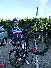 His father was musician Jo Alaphilippe, who died in June 2020 after a long illness (he attended the 2019 Tour de France in a wheelchair). His younger brother Bryan Alaphilippe also competed professionally as a cyclist, before retiring in March 2021.[83] His cousin is trainer Franck Alaphilippe.[84] In April 2020 Julian announced in an interview with L'Équipe that he was in a relationship with broadcaster and former racing cyclist Marion Rousse.[85][86] In January 2021 Alaphilippe announced via social media that the couple were expecting a child.[87] Their son Nino was born 14 June 2021.[88]