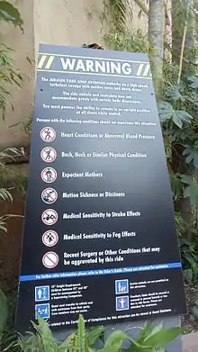 A technician began counting down when the building's life support systems would terminate (due to "toxic gases" released during the Tyrannosaurus encounter). The raft then climbed a small lift hill that brought it closer to the emergency evacuation drop. A second technician yelled, "If you can hear my voice, get out of there! It's in the building! IT'S IN THE BUILDING!".
