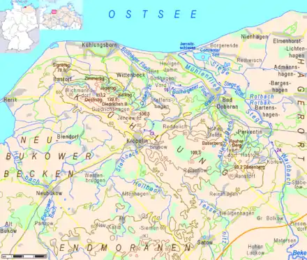 - Diedrichshagener Berg (129.8 m), highest summit in the range