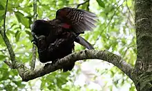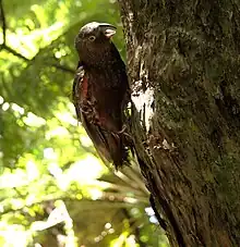The New Zealand kākā (Nestor meridionalis) is a large species of parrot of the family Nestoridae found in New Zealand's native forests. The species is often known by the abbreviated name kākā, although it shares this name with the recently extinct Norfolk kākā and Chatham kākā. Two subspecies of New Zealand kākā are recognised. It is endangered and has disappeared from much of its former range, though the re-introduction of North Island kākā at Zealandia in Wellington has led to an increasing population of the birds across the city.