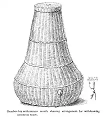 In his early years, Kunhikannan took an interest in natural history and made several casual observations and notes, in 1907[13] he observed that bats (Scotophilus kuhli) that roosted in hollows of coconut palms were infested by bedbugs that he identified as Cimex rotundatus.[14] In 1912 he noted that Papilo polytes was trimorphic in Bangalore.[15] As an agricultural entomologist, he was keenly sensitive to traditional practices and the economic situation of farmers. Keeping with the idea of cost efficiency in control measures against insects, he considered the use of a mesh below manure heaps that allowed coconut beetles (Oryctes) to burrow down as larvae but blocked the emergence of hard-bodied adults.[16] Kunhikannan held the view that ancient practices often had their roots in well-founded facts. He examined traditional storage technique which involved the use of bamboo bins and straw. He examined the effect of mercury vapour[17] on the control of pulse beetles in storage, a system used by Mysore farmers for centuries, and found them to inhibit the development of eggs when used in small containers.[18][19][20] He also found that some farmers used a layer of castor oil on the top of seeds placed in a bamboo bin along with a few drops of mercury. He found that the castor oil layer did help in keeping down emergence of pulse beetles. He also observed the practice of storing pulses under a layer of ragi. He found that pulse beetles emerge to the surface and do not return below, reducing the damage to pulses. He then found that a layer of sand at least half an inch thick at the top of grains helped in effectively controlling damage at little cost.[21] A similar approach was independently arrived by T.B. Fletcher based on studies in Pusa.[22] Kunhikannan also investigated traditionally used fish-poison plants and identified an alcoholic extract of Mundulea sericea as a treatment of wood against termites.[23][24] He noted the effectiveness of using a layer of kerosene in rice fields to control Nymphula depunctalis.[3][25]