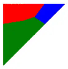 "A colloquial statement of this result is... if each of three people paint a triangle red, white and blue according to the KKM rules, then there will be a point which is in the red set of one person, the white set of another, the blue of the third".[3]