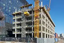 In July 2020, the structure of the building reached 60 metres (200 ft). In November of the same year, work was underway on the last office floors. Work was also carried out on the assembly of facade panels, which covered two of the three cuboids of the building in their entirety. In December 2020, the structure of the skyscraper was 115 metres (377 ft) and the last usable floor was being built.[11]