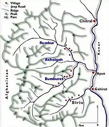 The inhabitants of the valleys are the Kalash people, who have a unique culture, language and follow a form of religion that is associated with their surroundings like the mountains and rivers.[1][2][3][4] The largest and most populous valley is Bumburet (Mumuret), reached by a road from Ayun in the Kunar Valley. Rumbur (Rukmu) is a side valley north of Bumburet. The third valley, Biriu (Birir), is a side valley of the Kunar Valley south of Bumburet.