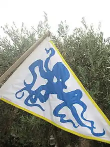 The KYC burgee, a design by British artist Thomas Hoar, features an azure octopus on a white background with yellow border.