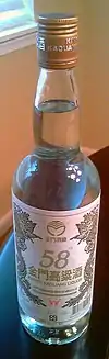 Kinmen Kaoliang Liquor is one of the most popular brands of kaoliang in Taiwan. As its name indicates, it is produced on the island of Kinmen. The mainstays of the range are the standard 58 percent and 38 percent alcohol bottlings. Kinmen's kaoliang production traces its roots back to the Chinese Civil War when Chinese nationalist general Hu Lien encouraged Kinmenese farmers to grow sorghum to produce hard liquor as importing alcohol from Taiwan caused financial strain. Kaoliang liquor has become an integral part of Kinmen's economy and plays a significant role in the culture of Kinmen.[2]