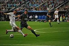 On 1 July 2009, it was announced that Lyon had reached an agreement with Spanish club Real Madrid for the transfer of Benzema. The transfer fee was priced at €35 million with the fee rising to as much as €41 million based on incentives.[61][62][63][64] On 9 July, Benzema successfully passed his medical and signed his contract, a six-year deal, later that afternoon.[65] He was presented officially as a Real Madrid player later that night at the Santiago Bernabéu Stadium, similarly to the previous signings of Kaká and Cristiano Ronaldo.[66] Benzema made his Real Madrid debut on 20 July in the club's opening pre-season friendly against Irish team Shamrock Rovers in Dublin, appearing as a half-time substitute.[67] He scored the lone goal in the club's 1–0 win, scoring in the 87th minute.[68] On 24 August, Benzema netted two goals in Real Madrid's 4–0 victory over Norwegian club Rosenborg in an annual friendly tournament organized for the Santiago Bernabeu Trophy.[69] The goals brought his total tally in the pre-season with Real Madrid to five, making him the joint top scorer alongside fellow striker Raúl.[70]