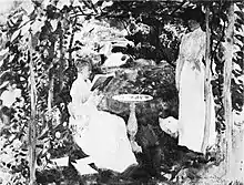 Katharine (reading) and Louise Loring in Study in Greens, by John Singer Sargent, inscribed "To my friend Miss Louisa Loring, Prides Crossing, October, 1917." The original was destroyed by a fire in 1969.