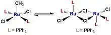 Caulton's early work on RuCl2L3 complexes provided an important contribution to the class of compounds molecule which would later become the primary precursor for Grubbs olefin metathesis catalysts.[1], [2], [3] Caulton performed early studies on the structure and dynamics of RuCl2L3 and RuCl2L4 (L = PPh3) in solution. Caulton concluded the dissociation of a phosphine from RuCl2L4 in solution can be significant.[4] Previously, the structure of RuCl2L3 had been shown to be square pyramidal.[5] Caulton further demonstrated that RuCl2L3 species dissociate phosphine in some organic solvents, and ultimately equilibrate with the dimer species [RuCl2L2]2. The dimer consists of a halogen bridge between the two square pyramidal structures.