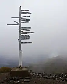 Keno City has also developed some tourism-based businesses, and its attraction is the Keno Mining Museum with an extensive collection dedicated to the history of mining in Yukon from the early 1900s until the present. The signpost on the top of Keno Hill showing distances to places around the world.[1]