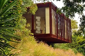 Between 2009 and 2013, a freestanding 24sqm studio was added. It is designed in dialog with but also in opposition to the original house; as stated on Godsell's website, they are 'connected by their common materiality of oxidised steel and recycled hardwood flooring, but are physically separate', and is ' deliberately solid and dark in comparison to the light filled and screened earlier house', and 'vertical, where the existing house is horizontal.'[11][12] The addition won the 2014 National Award for Small Projects from the Australian Institute of Architects.[13]