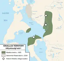 The traditional territory of the Kikiallus extended along the South Fork Skagit River to the confluence of the forks and the northern half of Camano Island, as well as some holdings on Whidbey Island near Strawberry Point.[4] The primary settlement of the Kikiallus was at kikiyalusali (meaning "Kikiallus place") at the mouth of Carpenter Creek near Conway, downriver from the present-day town. There were four longhouses there in the mid 19th century.[4][5] The Kikiallus also had villages at the confluence of the two forks of the Skagit River and at ʔəcəladiʔ (Utsalady Bay).[1][4][5][6]